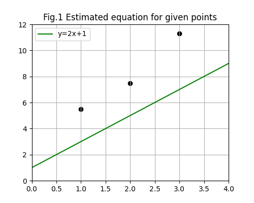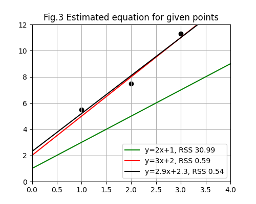 Say we have the training set {(1, 5.5), (2, 7.5), (3, 11.3)}. If we guess that m is 2 and b is 1, we would get the RSS as such: